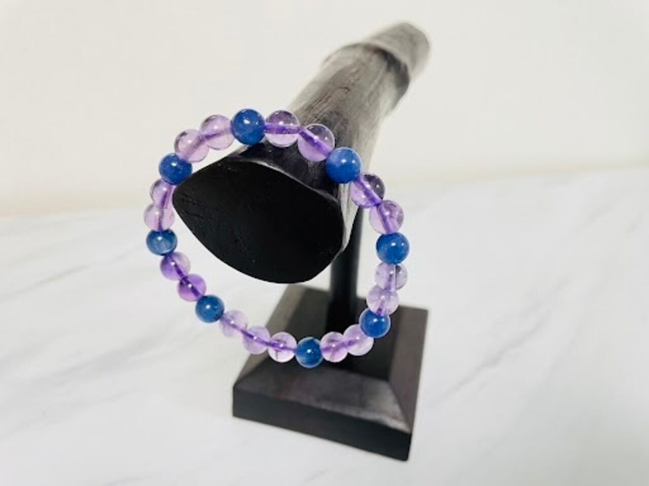 カイヤナイトとラベンダーアメジストを贅沢に組み合わせた、高品質の天然石ブレスレットが登場しました。カイヤナイトは、神秘的な色合いが美しく、マインド・ボディ・スピリットの調和をもたらすとされている石です。ラベンダーアメジストは、高級なアメジストの中でも上質な品質を示す、色合いが美しい石です。この2つの石を組み合わせることで、より深いリラックス効果や、精神力の強化効果を発揮すると言われています。